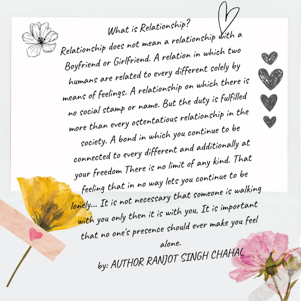 Relationship does not mean a relationship with a Boyfriend or Girlfriend. A relation in which two humans are related to every different solely by means of feelings. A relationship on which there is no social stamp or name. But the duty is fulfilled more than every ostentatious relationship in the society .A bond in which you continue to be connected to every different and additionally at your freedom There is no limit of any kind. That feeling that in no way lets you continue to be lonely… It is not necessary that someone is walking with you only then it is with you, It is important that no one’s presence should ever make you feel alone.
